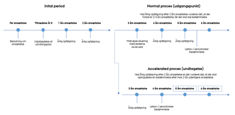 Accelereret proces: Hvis den opdaterede udviklingsplan entydigt viser, at den ansatte vil være på lektor-/seniorforskerniveau inden for 2 års ansættelse mere, laves der ikke en midtvejsevaluering. I stedet fortsætter de årlige opfølgninger indtil slutevalueringen 2 år efter.